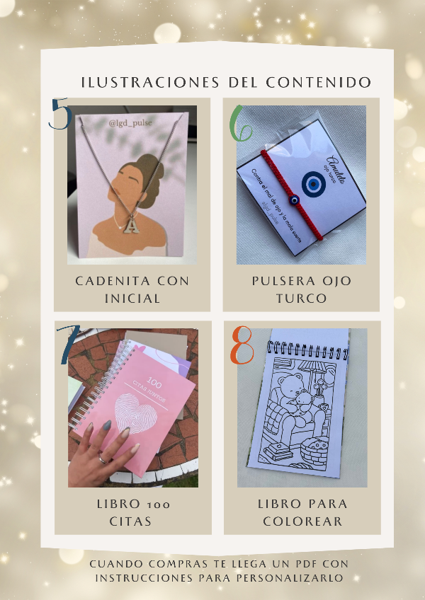 Vas a recibir una gran caja lista para abrir, que contiene 12 regalos numerados en cajitas o sobres de distintos tamaños, junto a una bolsita de packaging con tarjetas y stickers para personalizar.